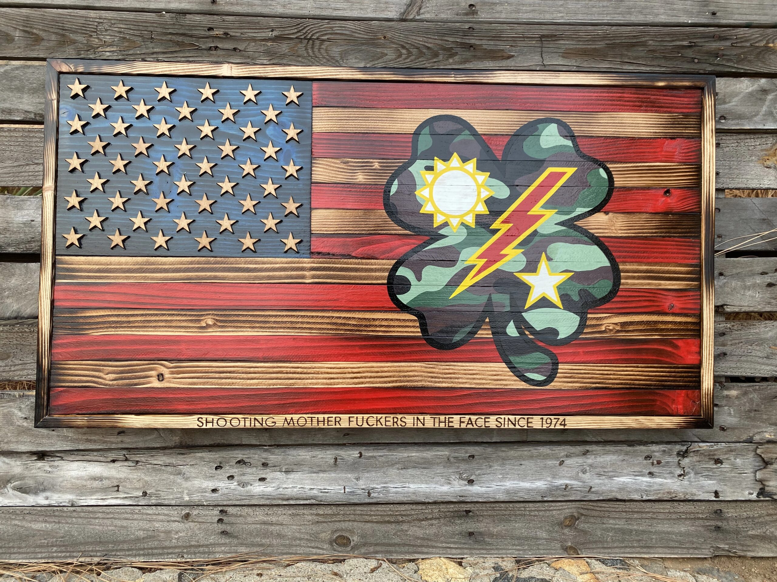 A Hero’s Legacy: Inspired by our first RANGER FLAG, custom-made for American Ranger James Gilchrist “JT”, who we collaborated with to make his “Ranger Flag”. J.T insisted that his flag design included a well known Ranger moto “Shooting Mother Fuckers in the Face Since 1974”. Of course, we’re not telling an ARMY RANGER how his flag should be made, so we burned is request into the lower frame. Our second Ranger Flag was made in collaboration with Kris “Tanto” Paronto, his design “Ranger 70/30” does not include the “Shooting Mother Fuckers in the Face” on the front of the flag, making it a little more “kid friendly” in homes. Both of these RANGER FLAG are a testament to the bravery and dedication of ARMY RANGERS and their families.