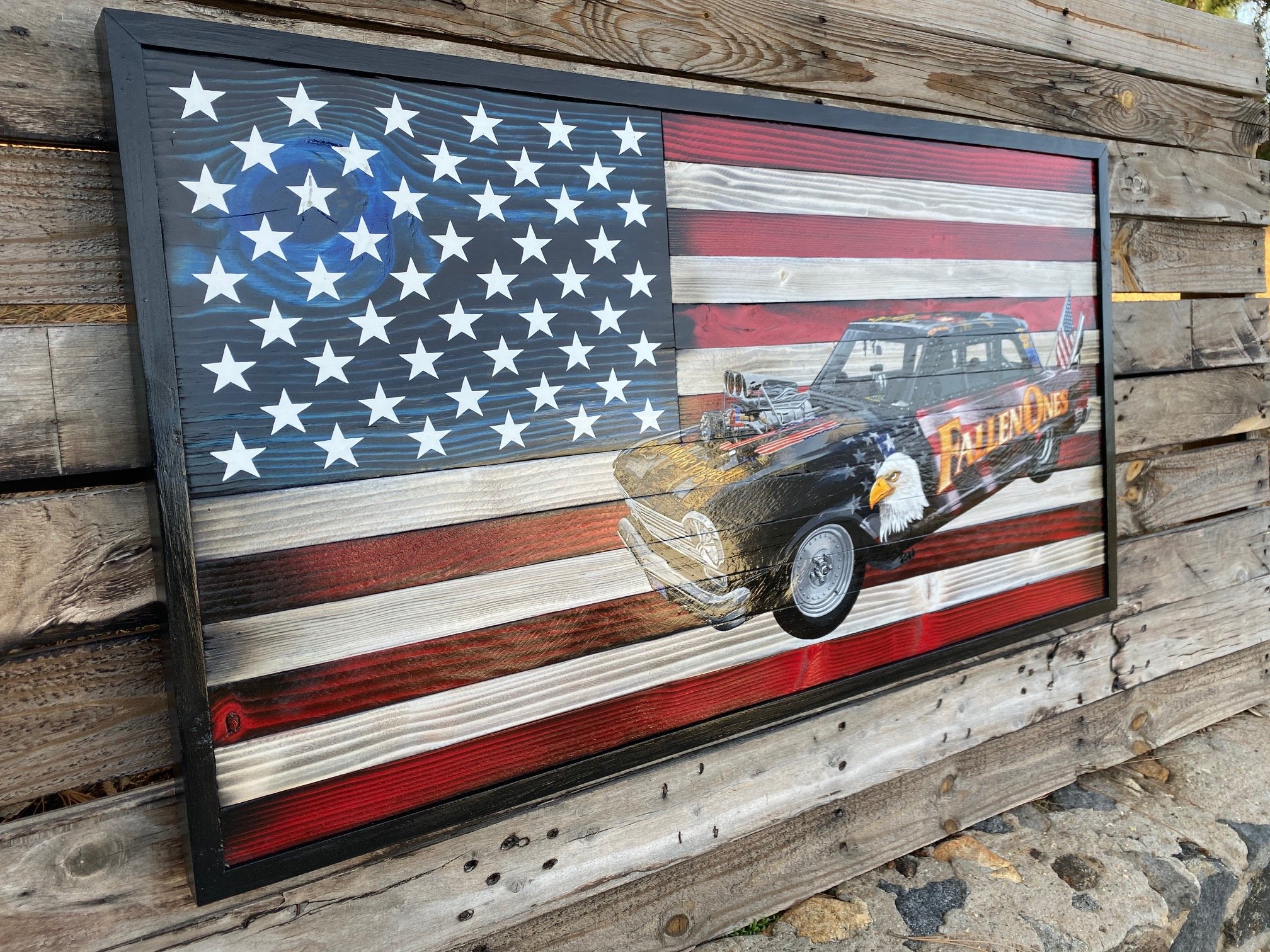 Get a handcrafted American Flag with a painted picture of your show car on it