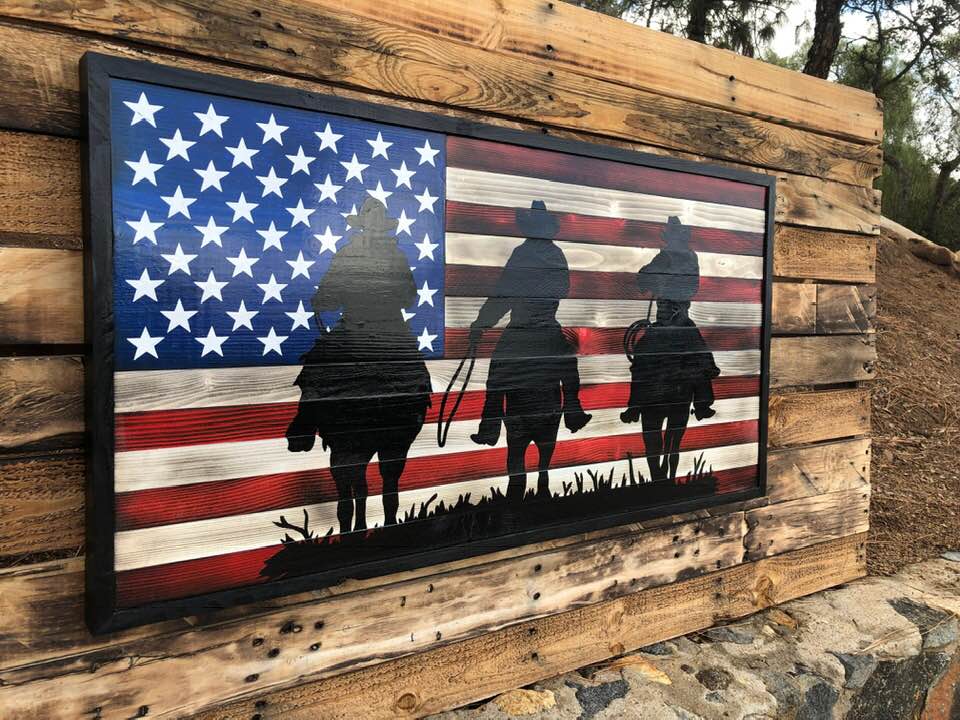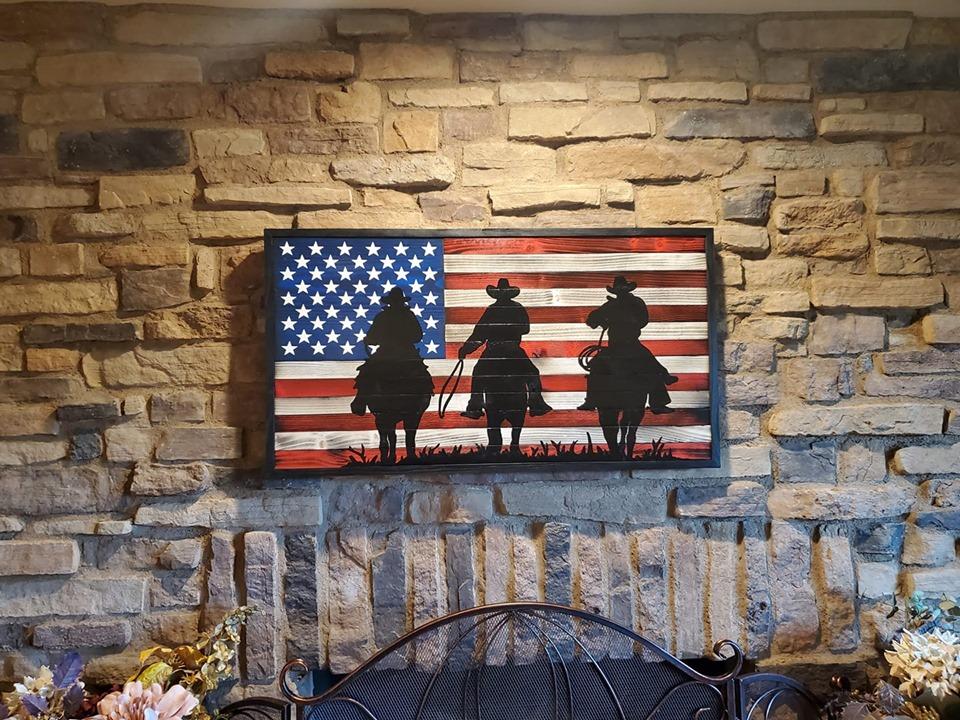 Our “Cowboy Posse” American Flag, like all our flags, is 100% handcrafted. No cheap stencils & spray paint, or other short cuts of any kind. Each flag is constructed how “Official” flags are with each flag having its own individual canton (stars) piece with 13 individual stripe pieces.